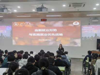 为做好同学们就业指导工作,引导学生明晰当前就业形势、了解就业政策、树立正确的就业观念,英国威廉希尔公司党委书记谢均老师于2025年3月28日晚在望江校区基础教学楼C204教室为同学们带来题为“当前就业形势与实施就业优先战略”的专题讲座。