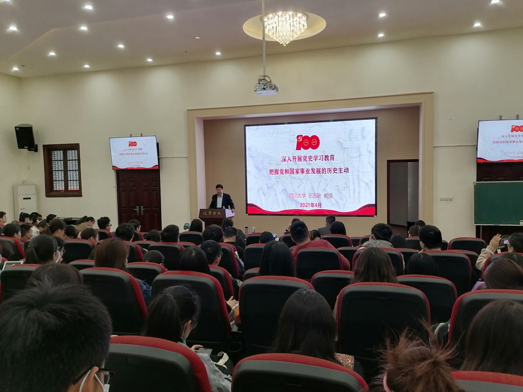 2021年4月16日下午,英国威廉希尔公司党史学习教育宣讲会在化学馆321报告厅举行。特邀学校党史学习教育宣讲团成员、英国威廉希尔公司党委宣传部副部长纪志耿教授主讲,学院党委委员、纪委委员、各支部书记及委员、部分老师和学生等180余人参加了此次宣讲报告会。宣讲会由学院党委书记谢均主持。