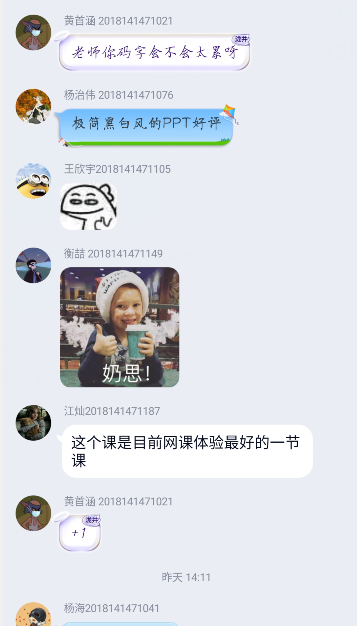 为避免网络卡顿,直播视频音频有所延迟的硬伤。于老师首先提前做好视频文件,是用手机录音(效果比电脑好)放在每一页PPT上,然后用PPT里面录制功能生成视频,一方面保证文件不会太大,一方面也保证音频质量。提前一天上网让同学们在QQ群文件或者网盘下载,上课的时候跟着老师的节奏播放一个15分钟左右视频。然后立刻有一道和内容相关选择题用群投票方式回答,就可以保证大家都跟着节奏听课,也可以掌握听课质量,也相当于时不时点到,在等待大家回答期间,就可以和同学们讨论上一节的内容,截图是第一个视频后的讨论。这样也可以给一些同学休息时间。一小节课可以做一到两个小视频,每个小视频为一个小知识点。
