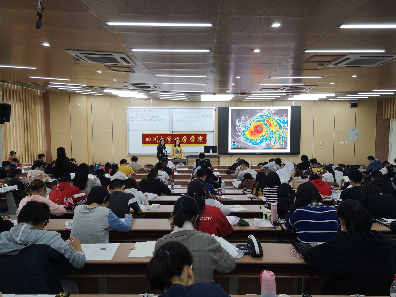 讲座结束后,同学们进入江安综合楼C座考场进行初赛笔试。今年共有来自全校30个学院800多名学生参赛。在笔试过程中,参赛同学遵守考场纪律,认真作答。在学院老师及院学生会同学的共同努力下,本次“宏坤·银杏杯”化学知识竞赛初赛成功举办,预祝参赛同学在接下来的比赛中取得好成绩!